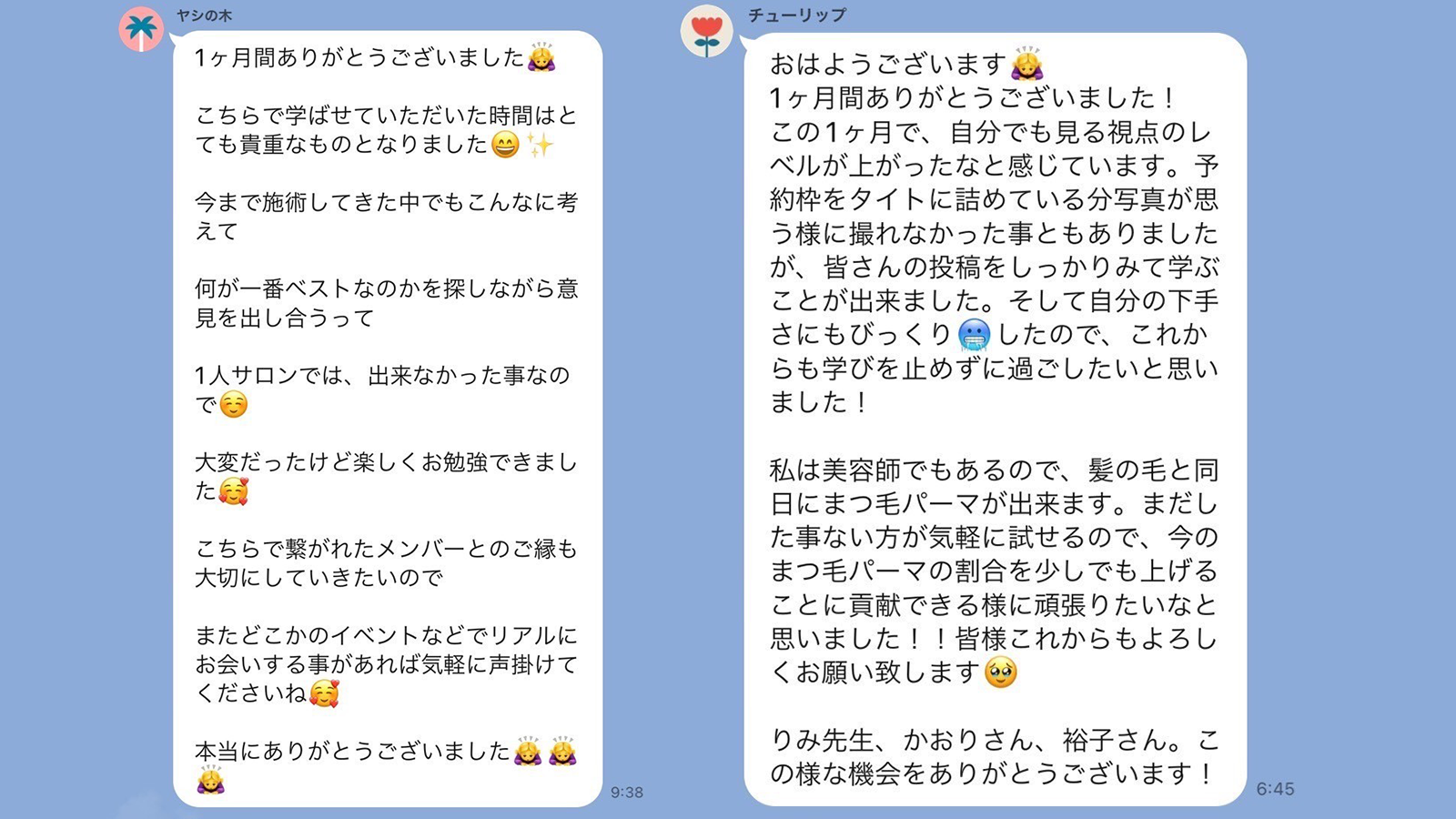 1か月間LINEグループ内で添削し合い、技術を向上させていきま す。5~10名のLINEグループを作り、施術写真をひとり00枚送り 合います。統括講師と部員たちで上手くいかない原因を探り合い、 コツをアドバイスし合います。 インプットするだけではスキルアップには繋がらず、アウトプッ トしてはじめて自分の身につけることができるのでひとりひとり がアウトプットさせるのがここでの最大の目的になります。